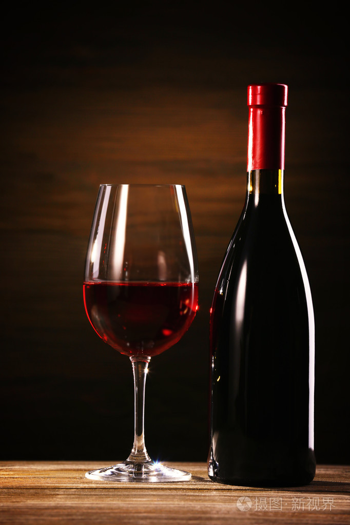酒杯和木制背景上的瓶子