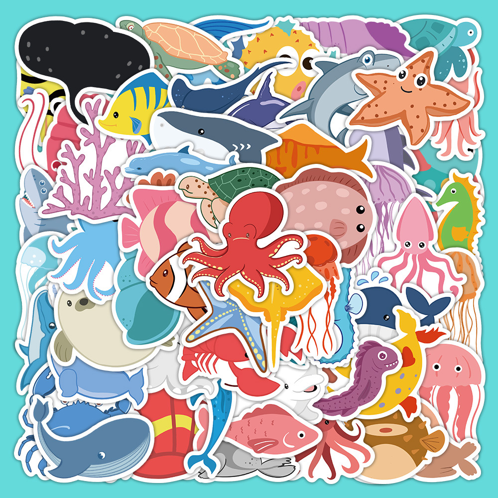 60张卡通绘画海洋生物贴纸装饰贴画手帐防水行李箱滑板车墙面装饰