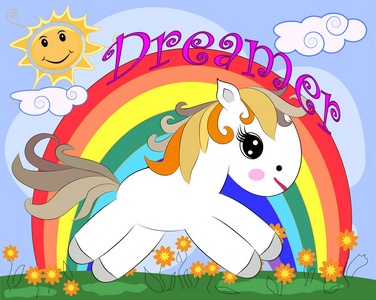 白色的小马在一片空地上,有花彩虹的太阳. 儿童插图童话故事照片