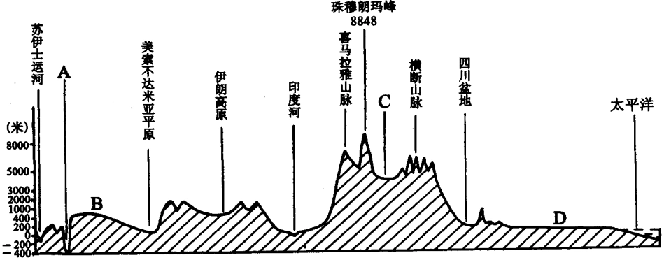 地形剖面图 亚洲地势特点: 中部高,四周低 亚洲大陆30°n地形剖面