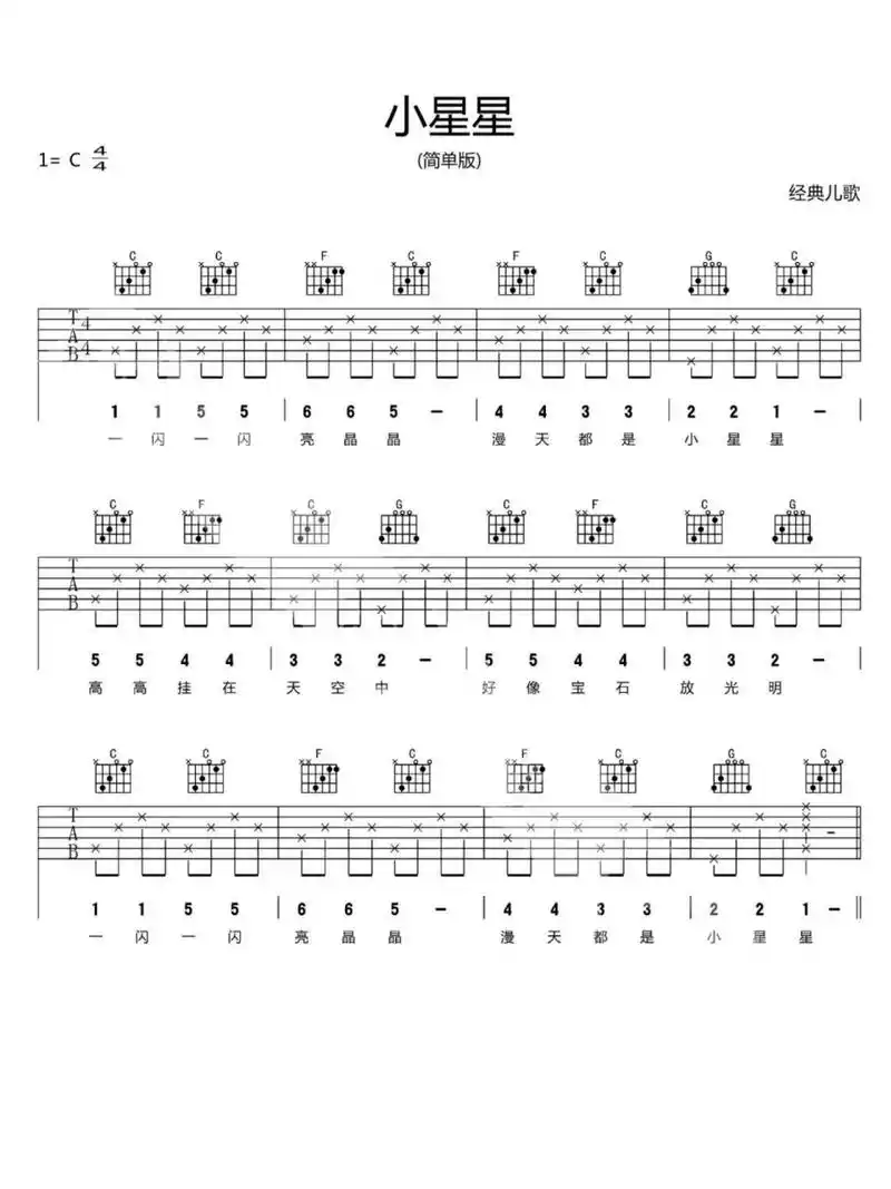 小星星吉他谱c调指弹六线谱单音版吉他谱