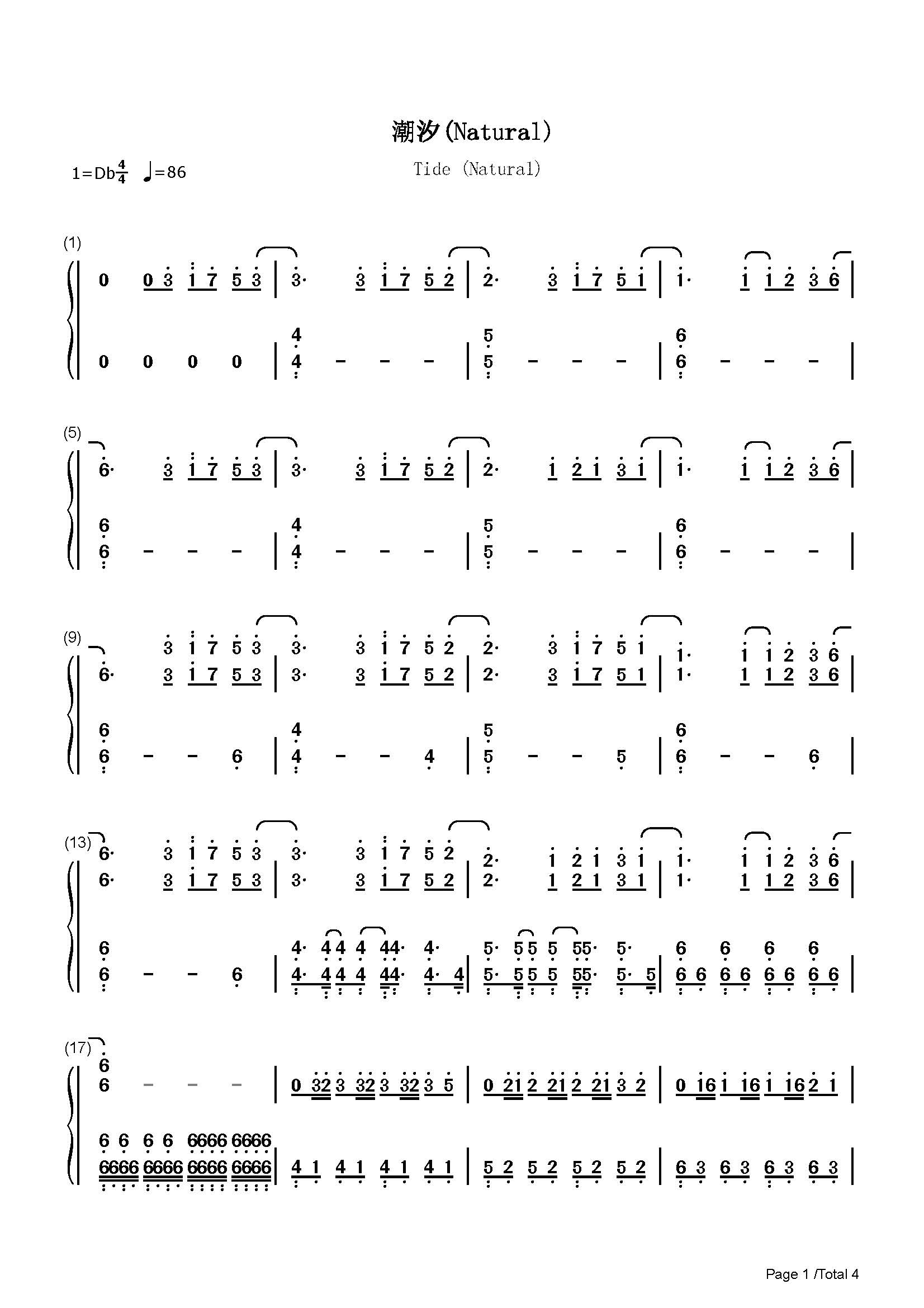 潮汐 natural-完美独奏谱-蓝色的海底远山的风景-抖音双手简谱预览1