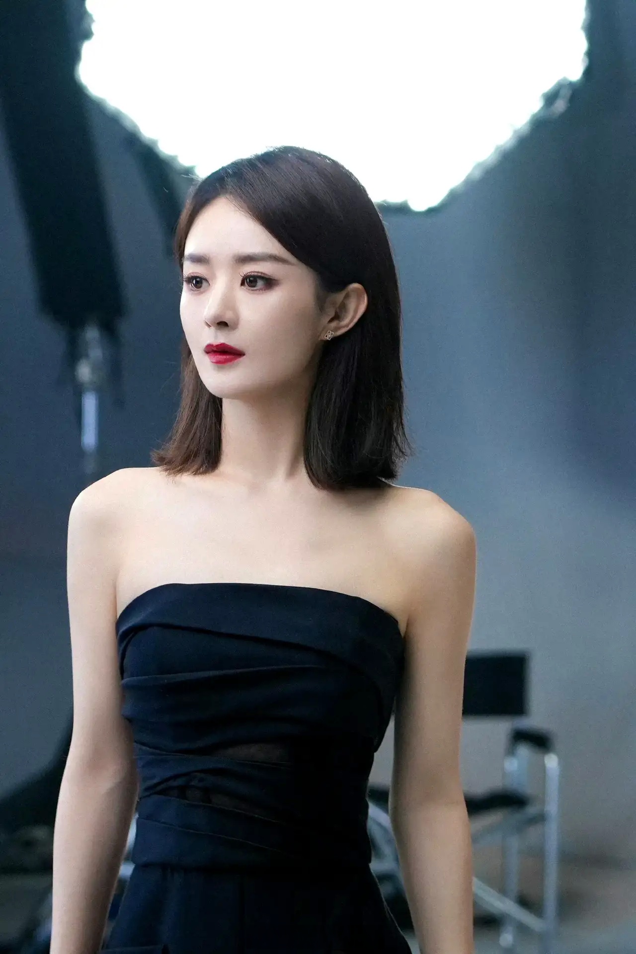 赵丽颖×cl花絮照,黑色抹胸连体裤装,齐肩短发,红唇