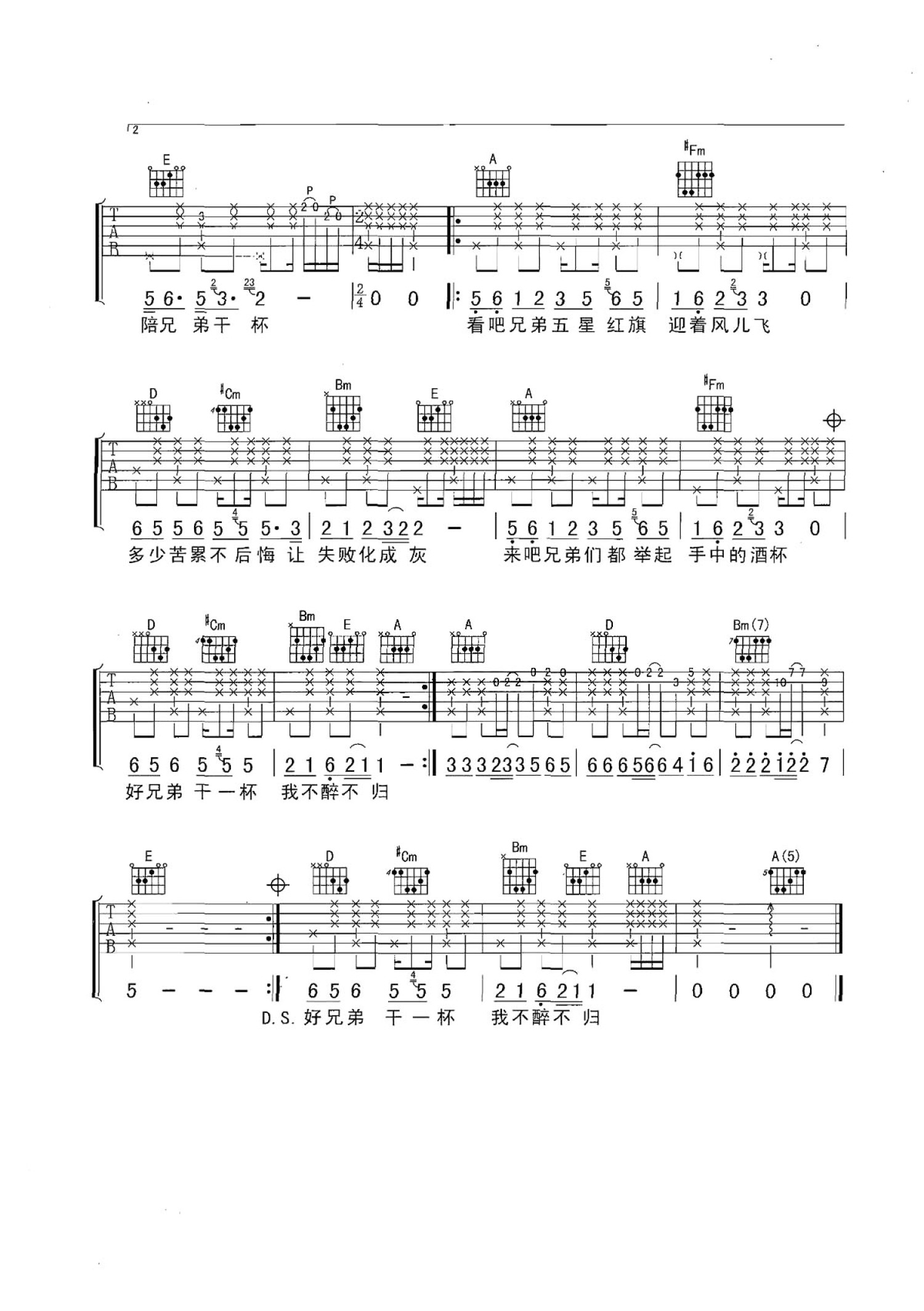 兄弟干杯吉他谱c调扫弦六线谱高清图片谱庞龙