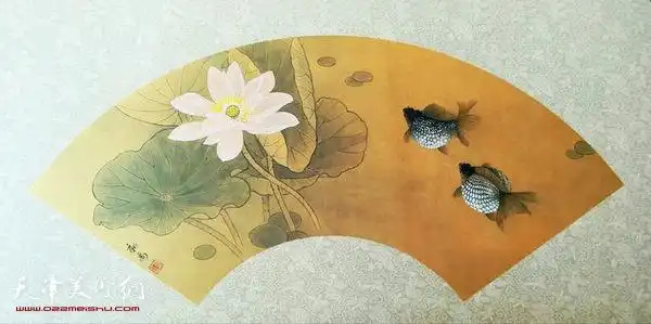 天津著名画家李新禹金笺金鱼扇面欣赏