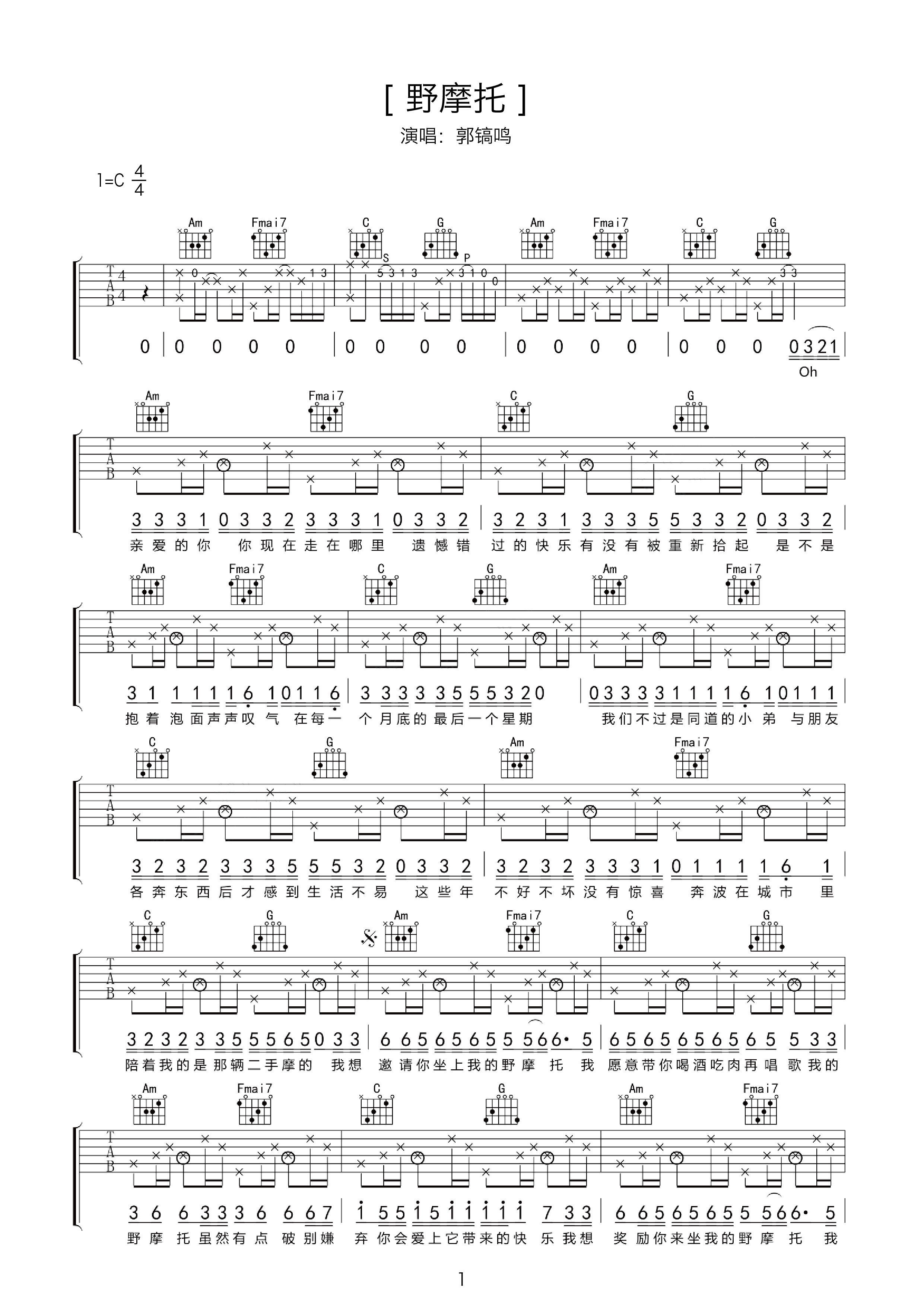 郭镐鸣野摩托吉他谱c调吉他弹唱谱