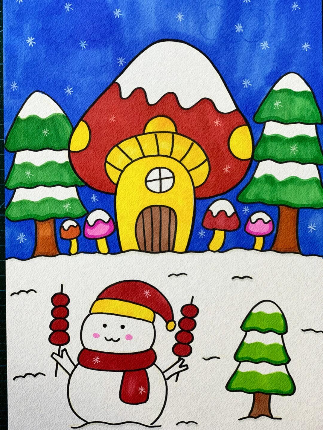 美丽冬天儿童画电子版小学生美丽乡村家乡雪景雪人简笔画绘画作品