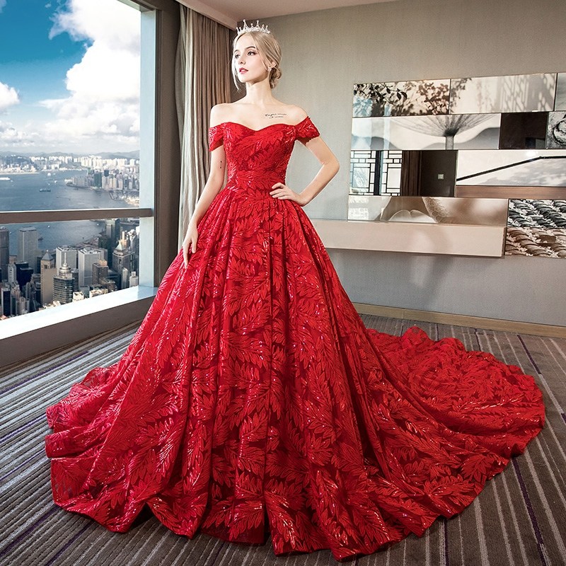 名门新娘红色婚纱礼服 新娘齐地2016新款一字肩婚纱红色春季2398 红色