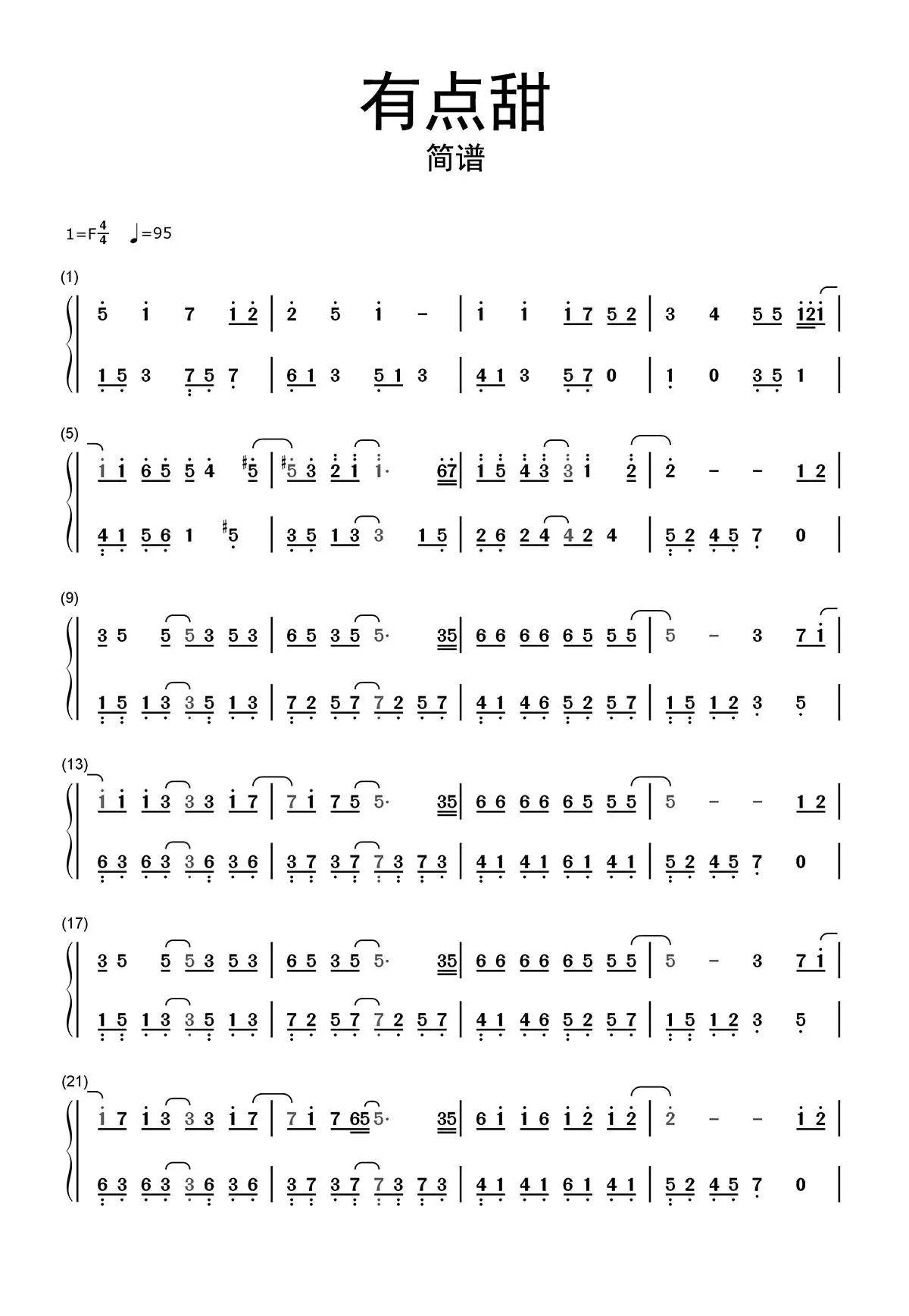 有点甜_汪苏泷_f调 _流行钢琴双手简谱_钢琴谱|钢琴五线谱|钢琴简谱