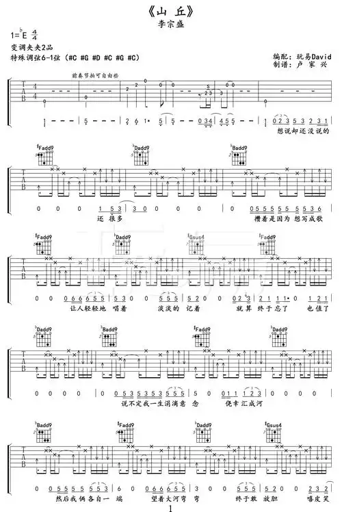 山丘吉他谱,李宗盛的一首经典代表歌曲,原调降e,变调夹夹二品,特殊