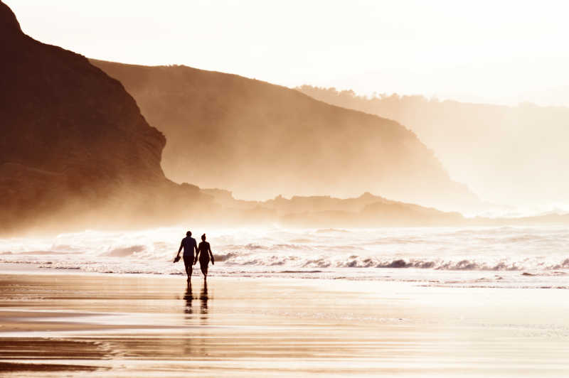 有雾气的天气下在海滩上牵手的夫妇