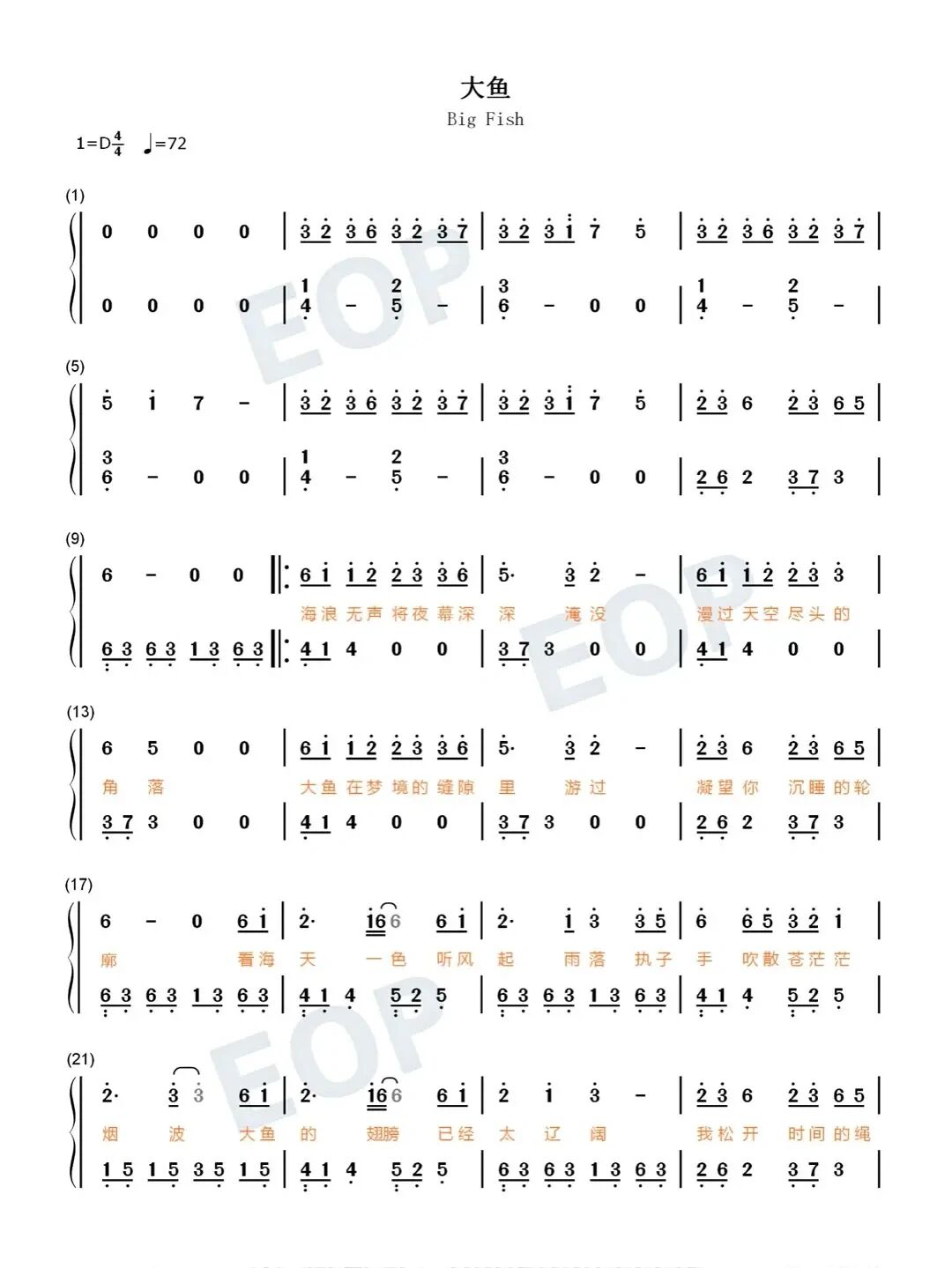《大鱼》简谱,钢琴谱