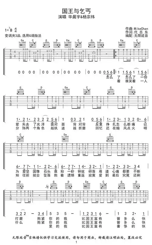 国王与乞丐-华晨宇/杨宗纬 g调指法编配bb调六线吉他谱-虫虫吉他谱