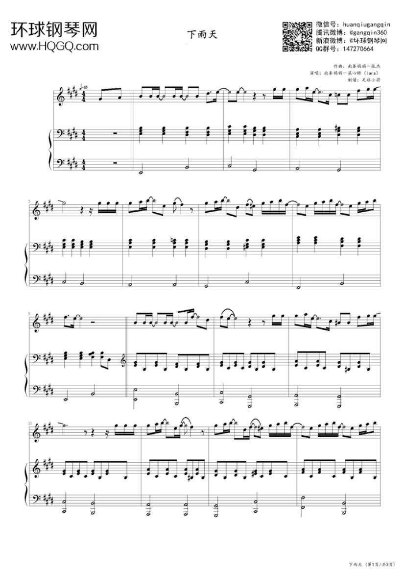 钢琴谱:下雨天--弹唱