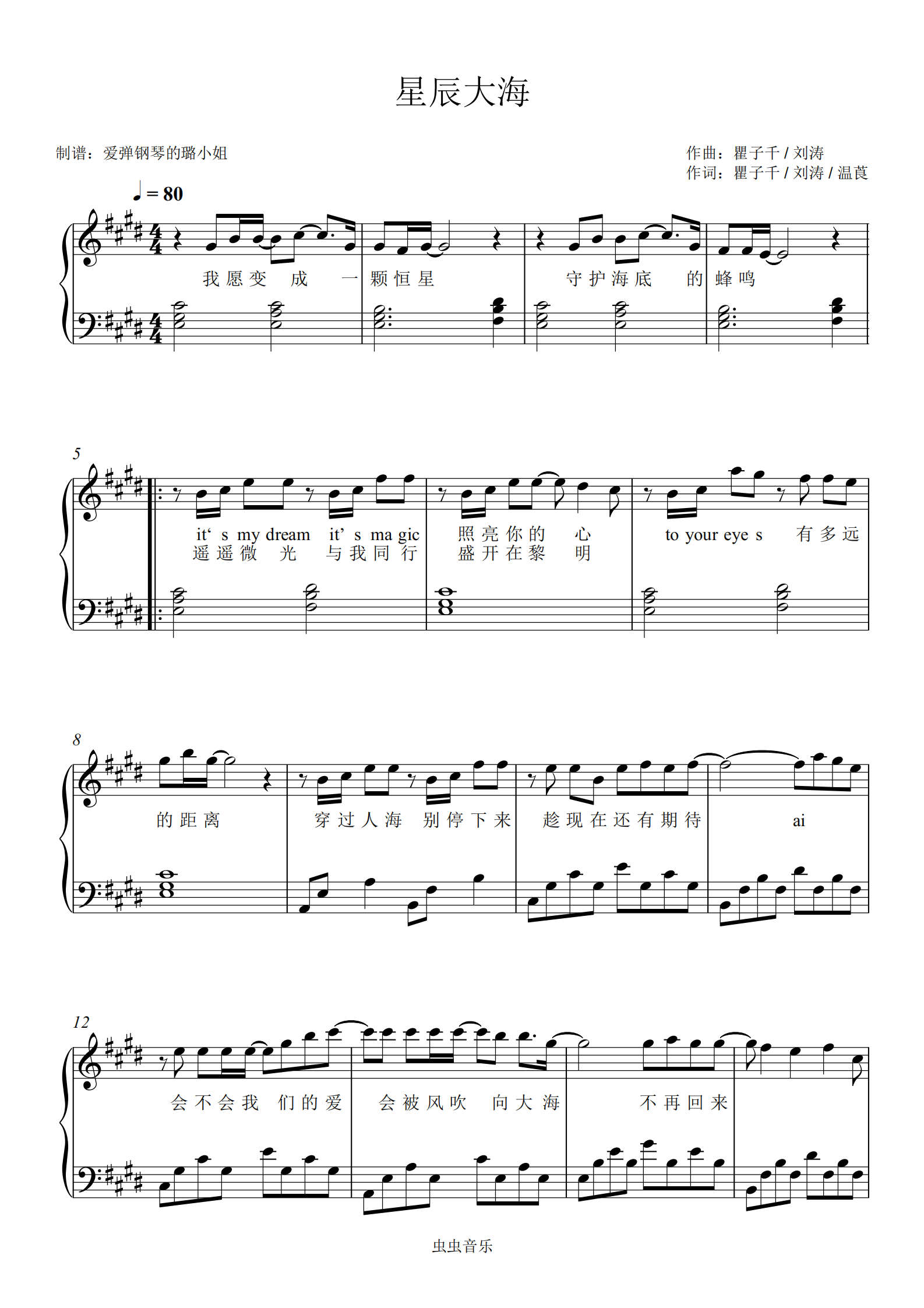 《星辰大海(演唱:黄霄云)》简谱黄霄云原唱 歌谱-简谱之家制谱-钢琴谱