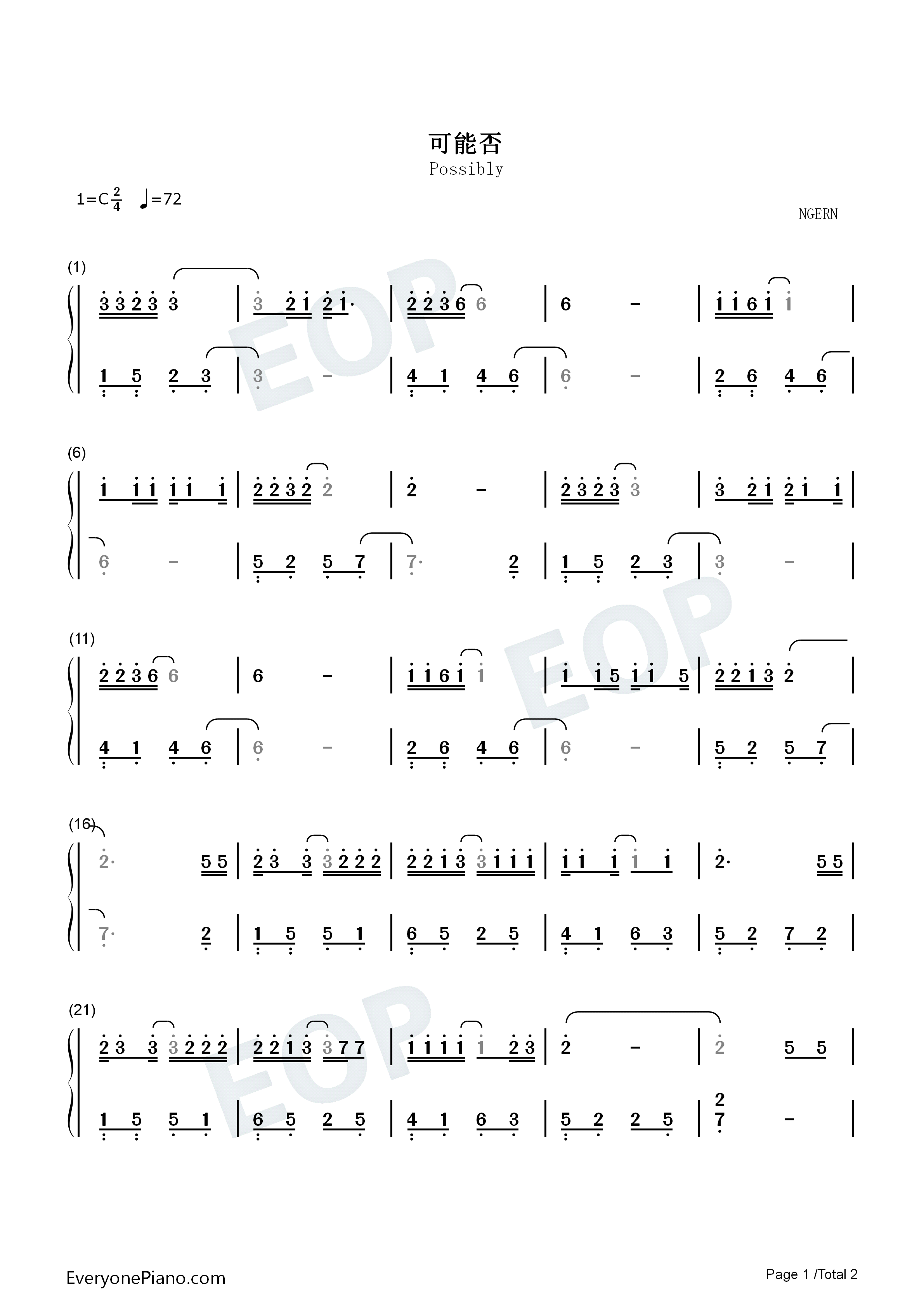 可能否-c调简单版-抖音热歌双手简谱预览1
