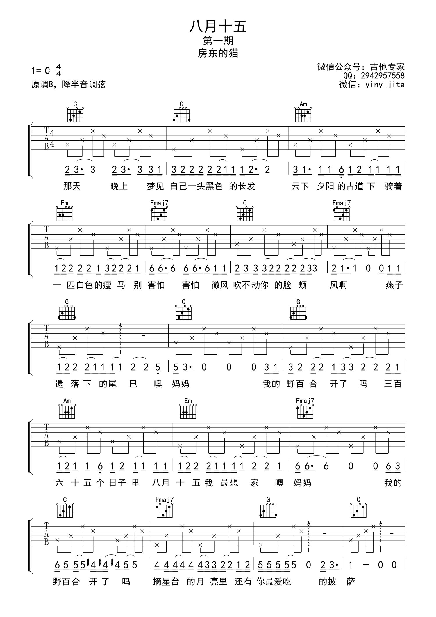 房东的猫八月十五吉他谱c调吉他弹唱谱