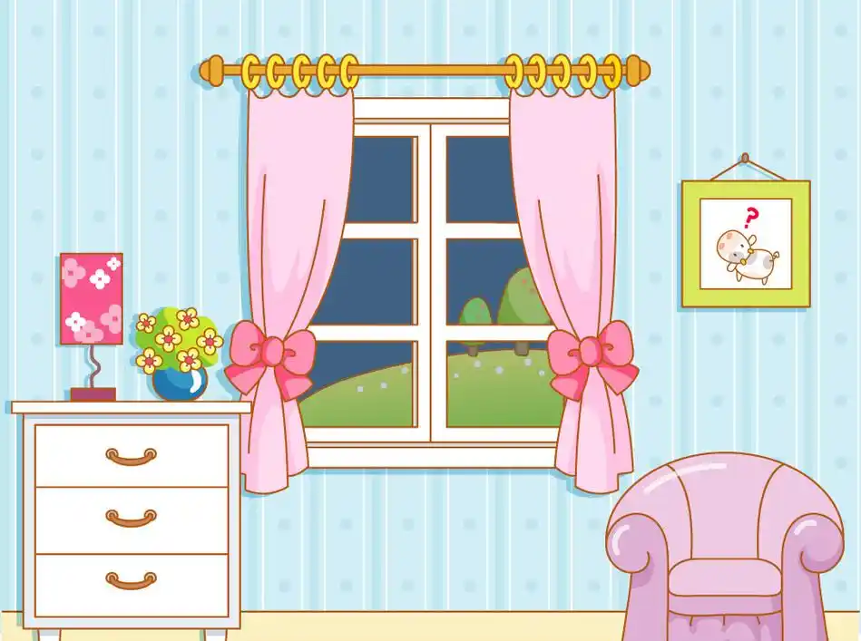 漂亮的卧室在粉红色的颜色.家里的家具.卡通.矢量