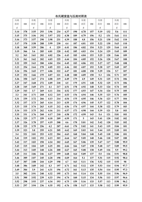 布氏硬度值与压痕对照表