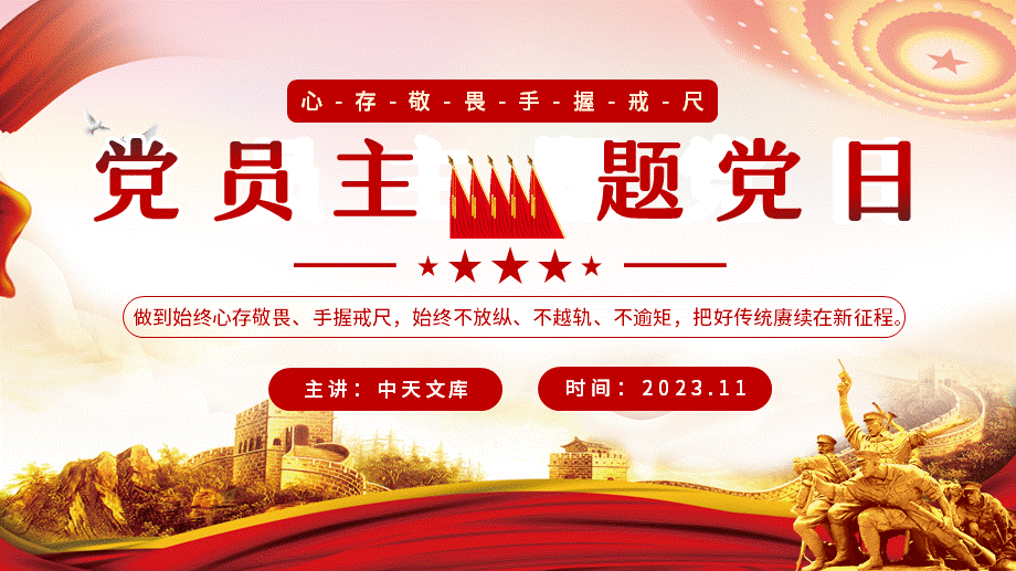 党员主题党日ppt模板含完整内容做到始终心存敬畏手握戒尺始终不放纵
