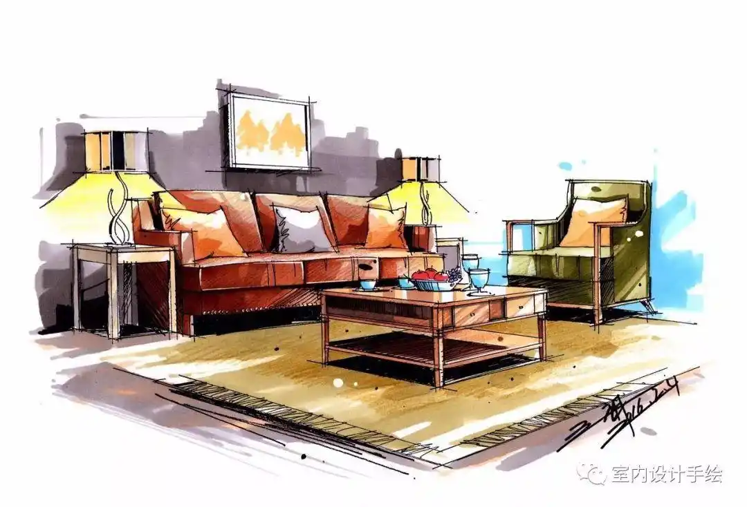 【手绘】几张室内手绘组合马克笔上色成品图分享!