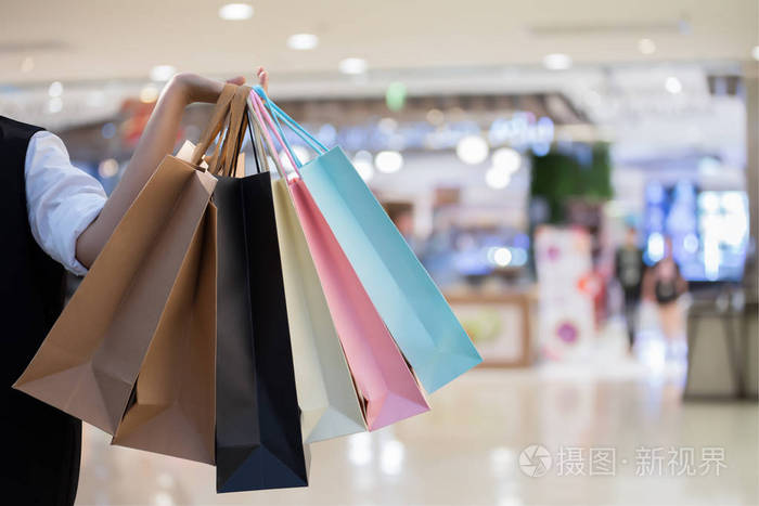 快乐的女人在街上带着购物袋购物, 享受生活方式