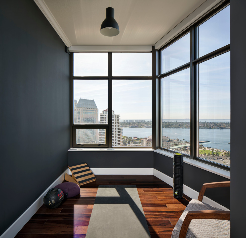 阳台的另一边是个小健身房,在家就能跑步锻炼身体.