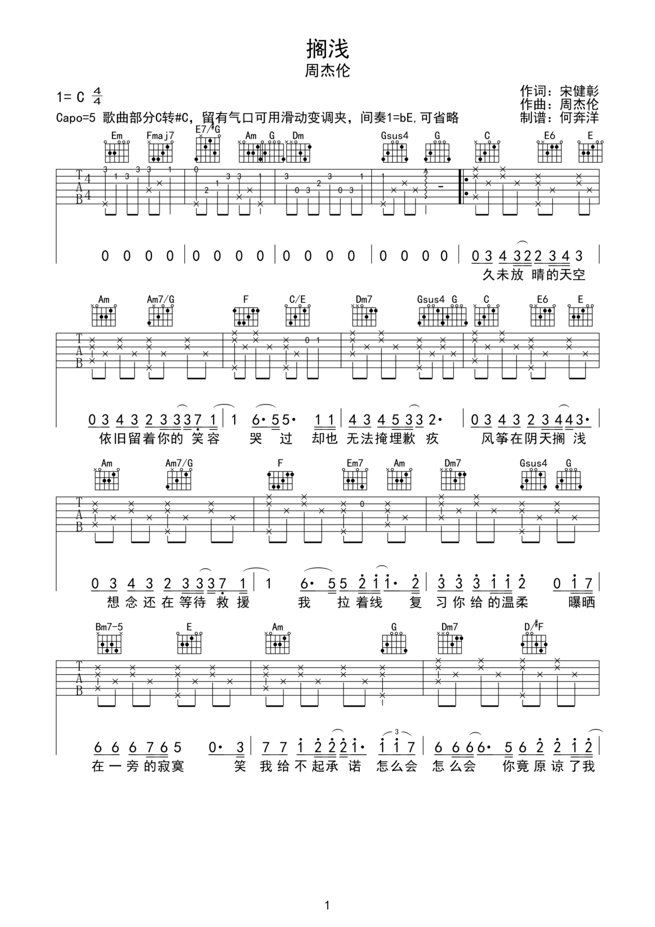 周杰伦《搁浅》吉他谱_c调_变调夹5品_吉他六线谱_简单弹唱版
