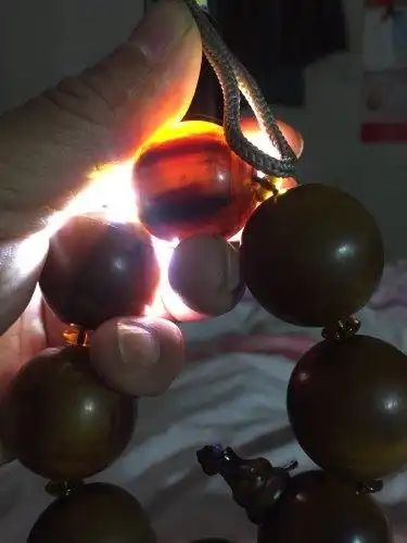 灯光从后面向前打,看犀牛角的特征主要有三点:一是横截面有鱼籽纹;二