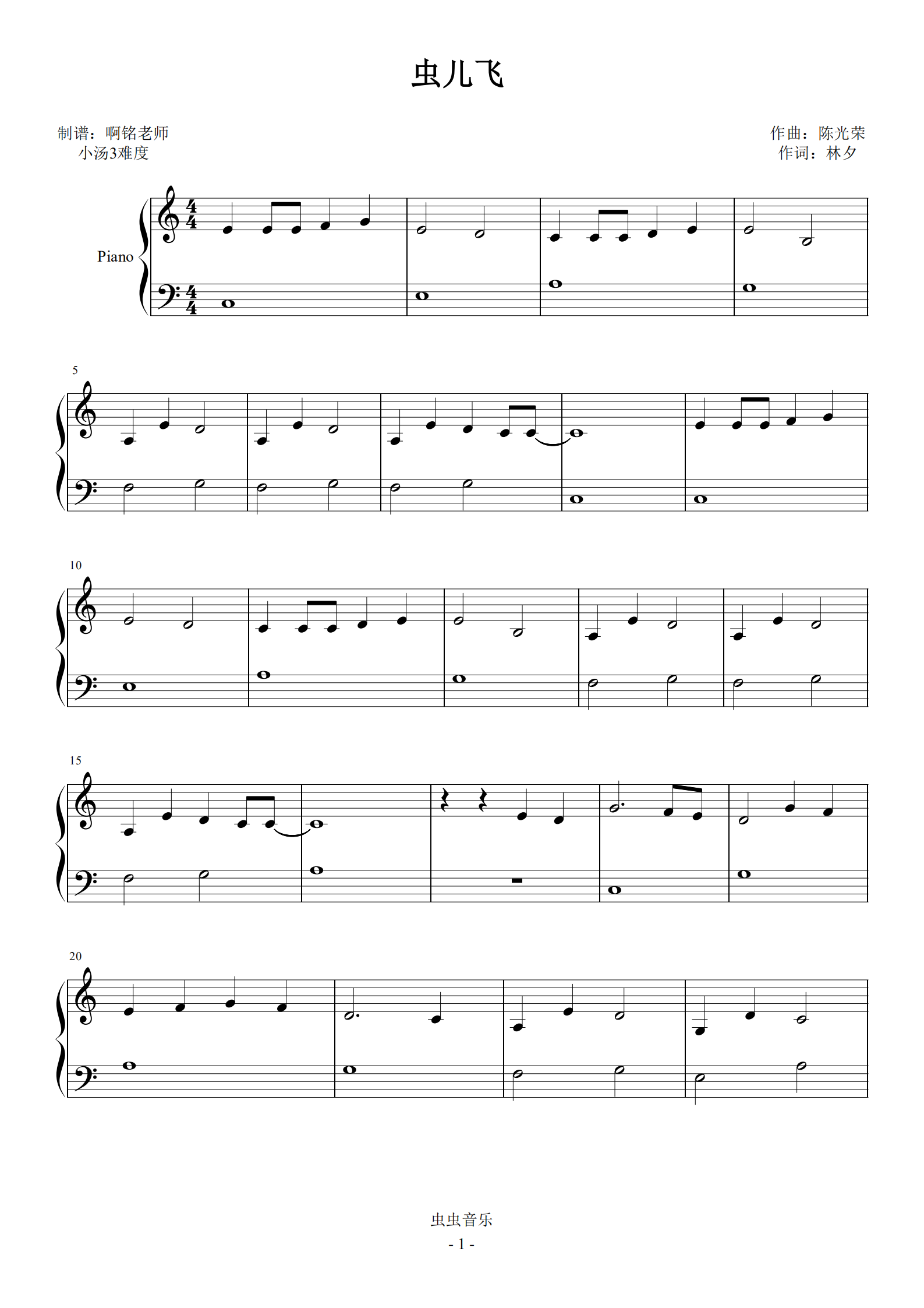 虫儿飞 小汤3 难度钢琴谱-c调-虫虫乐谱