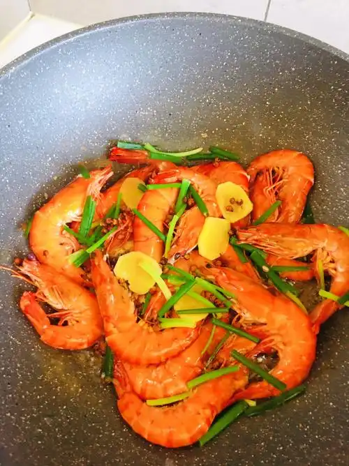 白灼虾做法:1.锅内铺葱段姜片,再放上虾2.