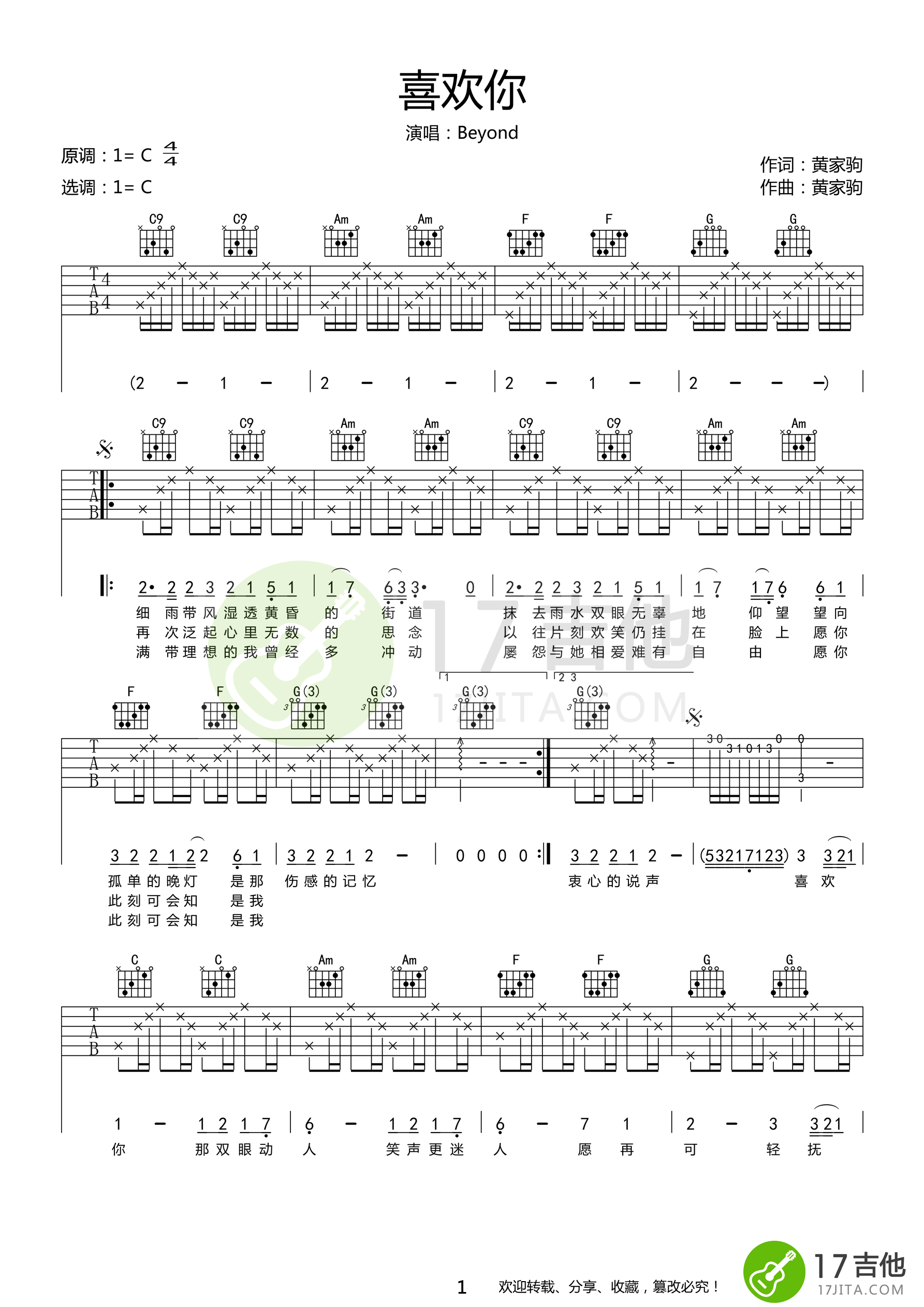 beyond喜欢你高清吉他谱