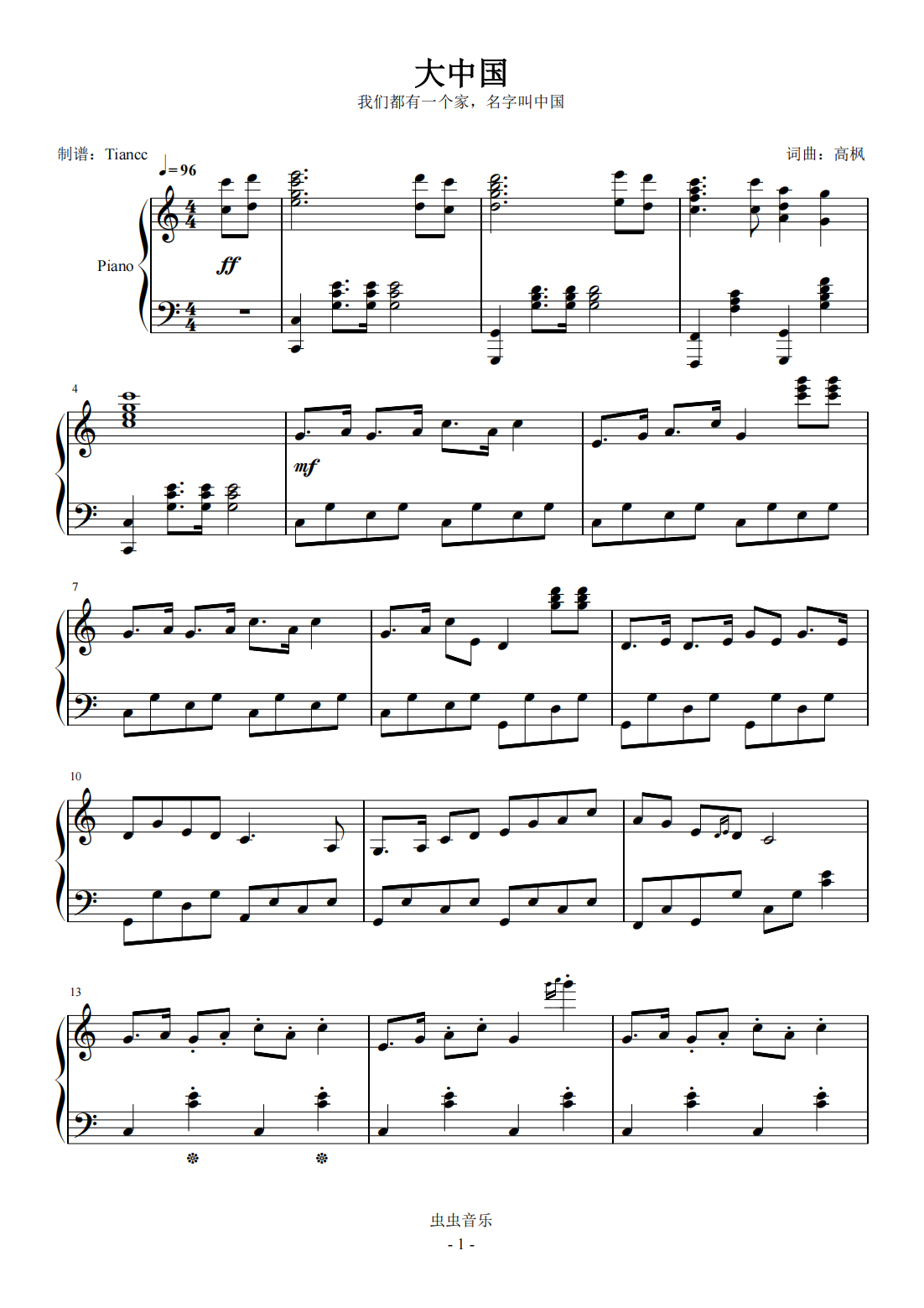 大中国钢琴谱-c调-虫虫钢琴