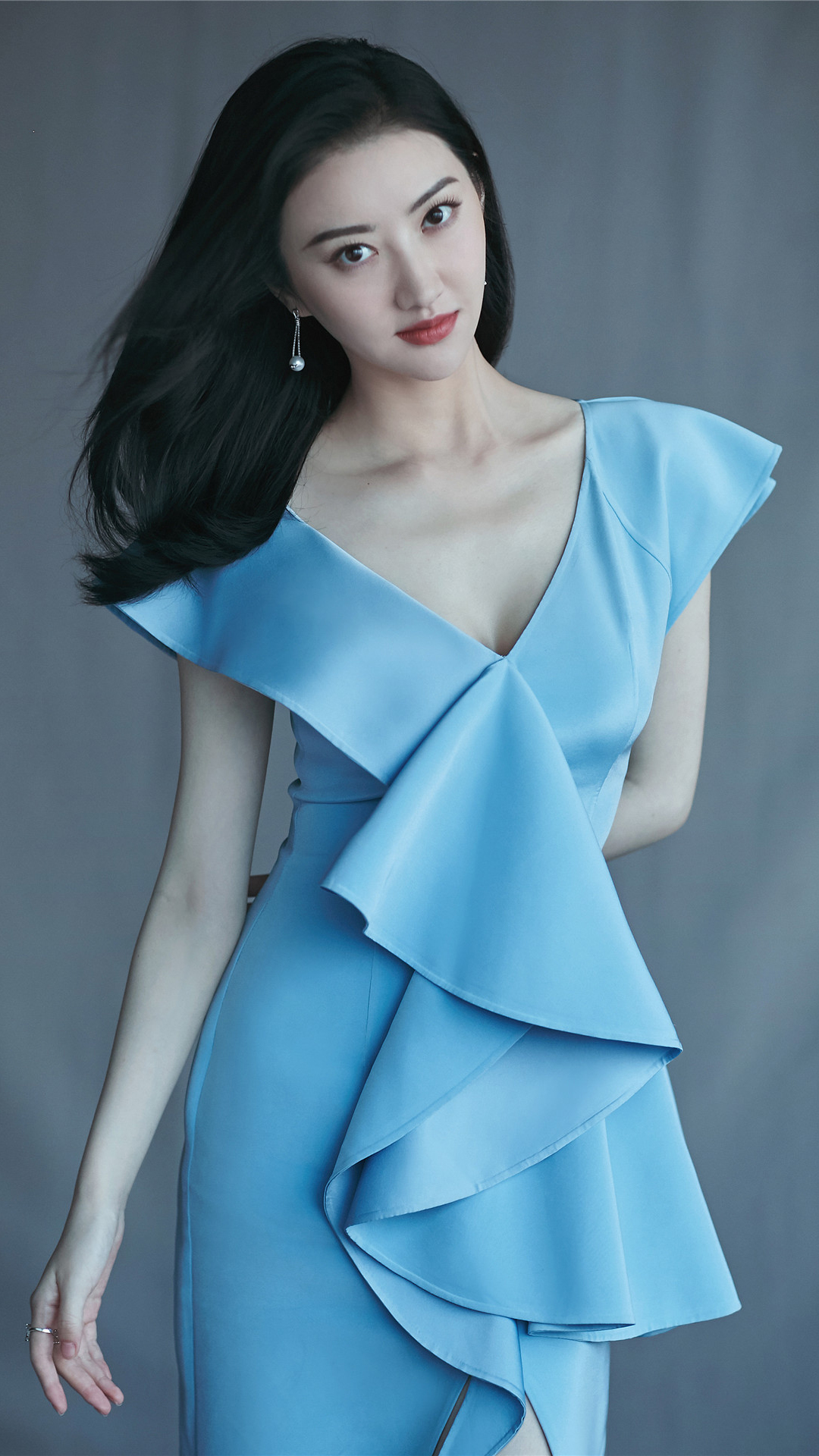 迪丽热巴cosmo红毯造型 / 身着蓝色闪片大v领礼服裙