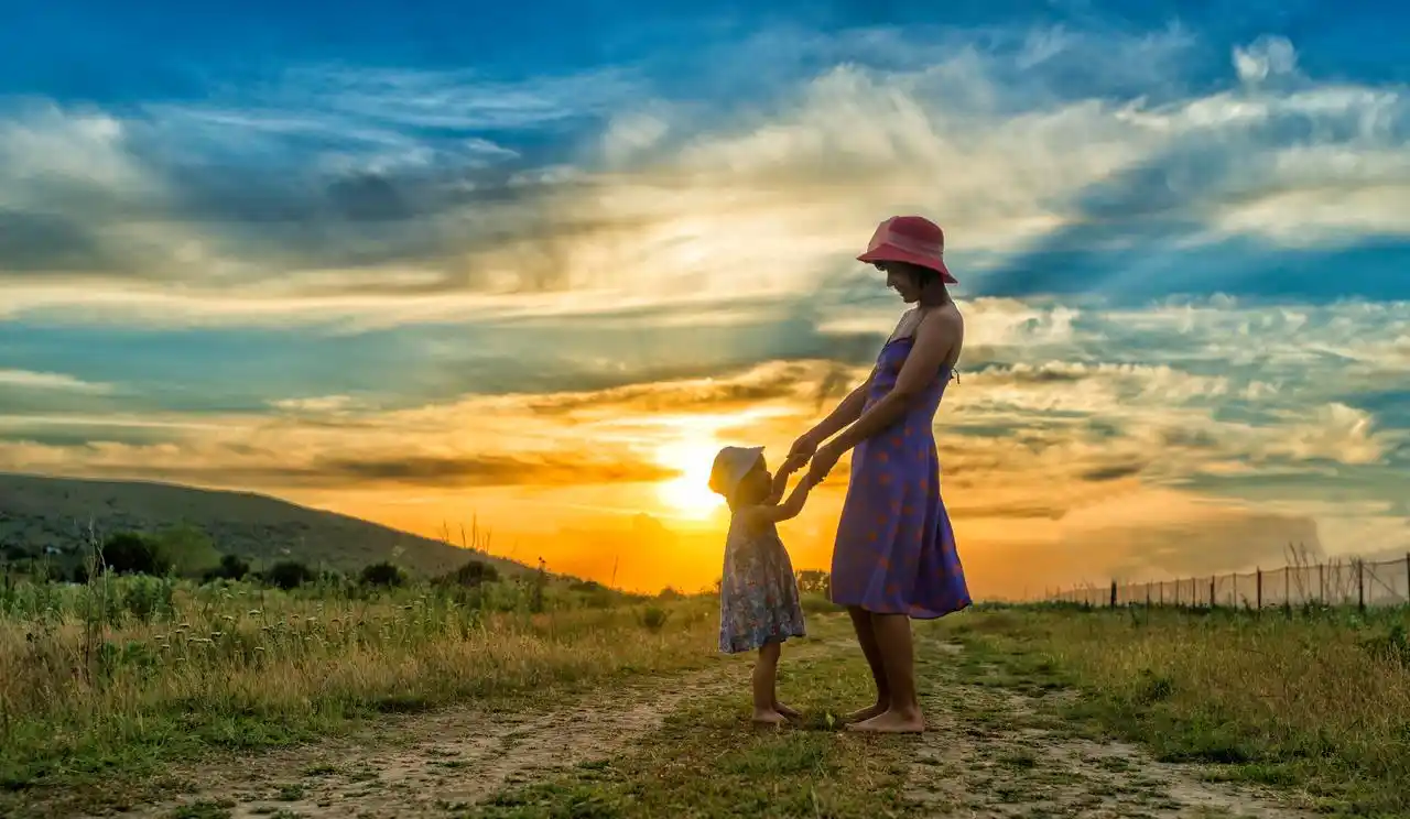 日落的时候幸福的母亲和女儿在户外开心的玩耍幸福童年孩子幸福的人