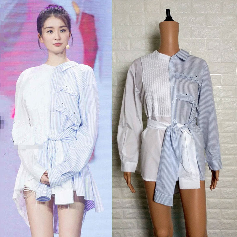 欢乐颂2关关雎尔乔欣明星同款夏拼接条纹衬衣中长款衬衫