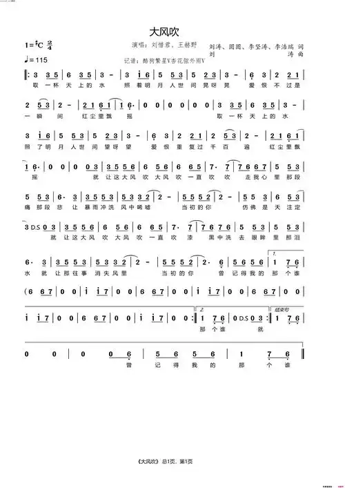 大风吹简谱-刘惜君演唱-刘涛,圆圆,李坚涛/刘涛词曲1