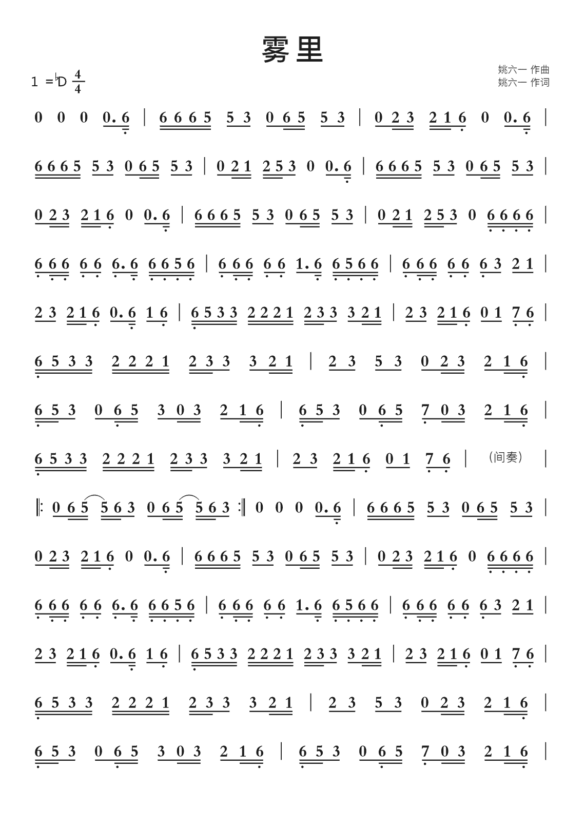 姚六一雾里钢琴五线谱双手简谱