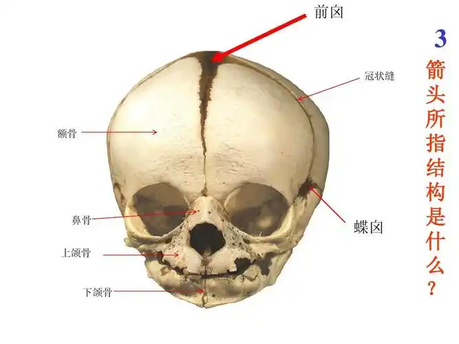 前囟 3 冠状缝 额骨 鼻骨 上颌骨 蝶囟 下颌骨 箭 头 所 指 结 构