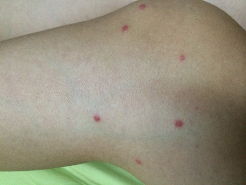 问:腿上胳膊上起了很多红点,后来越来越多,现在红点继发变成小水泡一