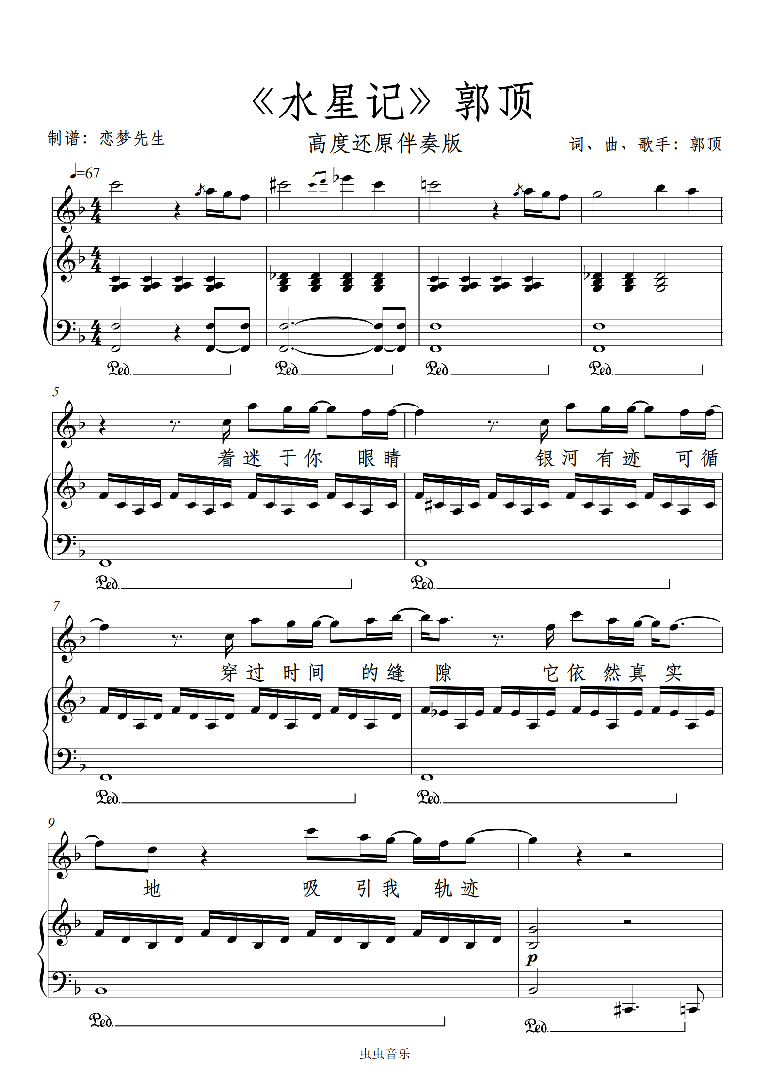 《水星记》郭顶.高度还原弹唱版钢琴谱-成都金堂.郭老师-虫虫钢琴