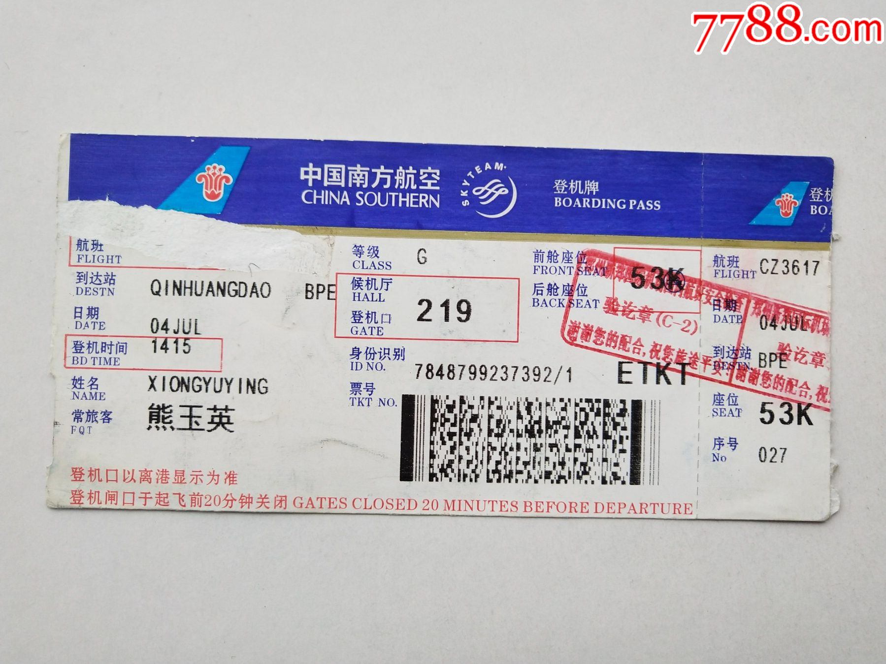 中国南方航空登机牌-飞机/航空票-7788商城__七七八八商品交易平台