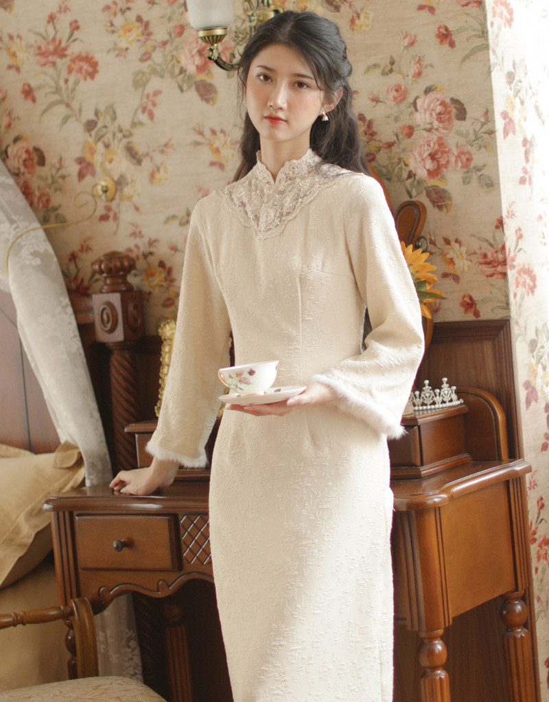 白色旗袍2022年新款冬季改良复古中国风老上海长袖长款蕾丝连衣裙
