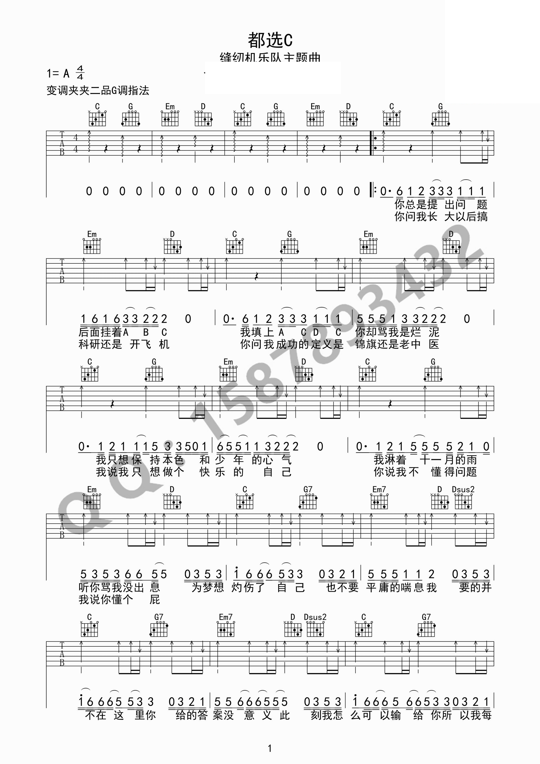 都选c吉他谱_g调弹唱谱_缝纫机乐队_六线谱
