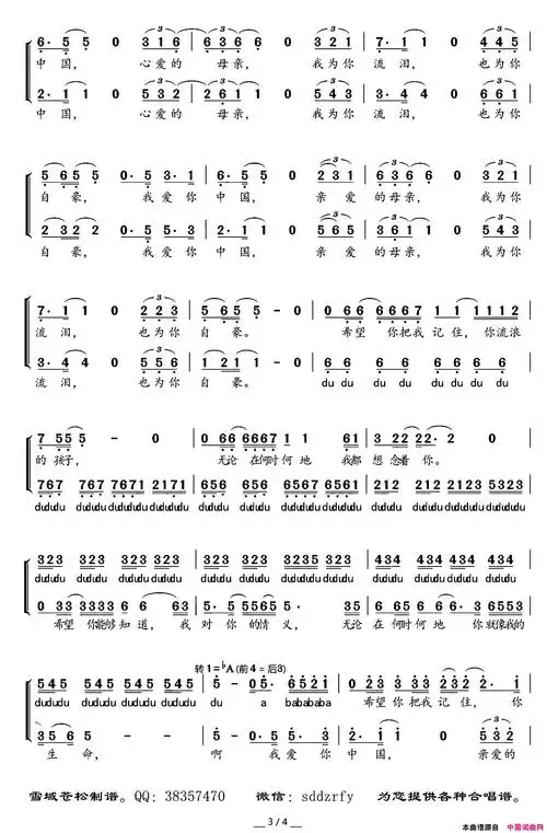 我爱你中国二声部简谱-汪峰演唱-汪峰/汪峰词曲1