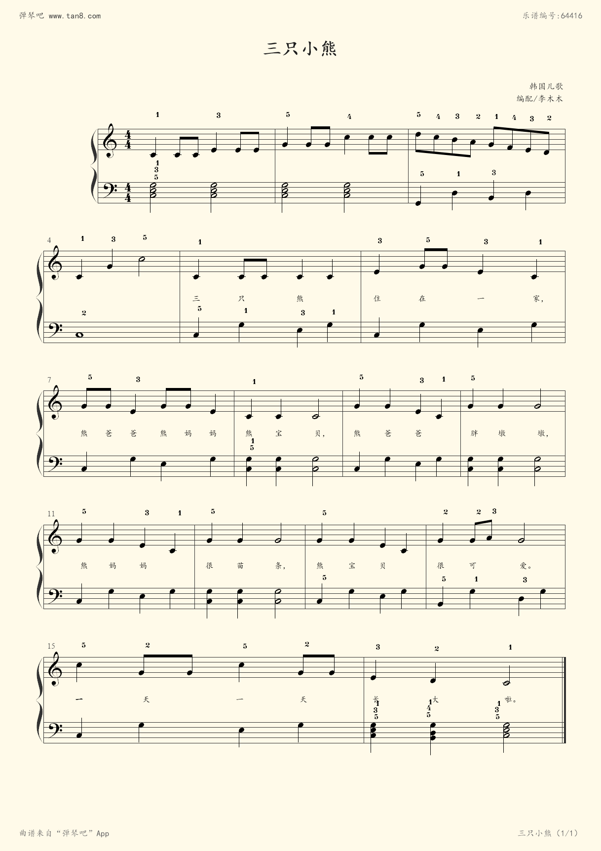 《三只小熊,钢琴谱》带歌词,韩国儿歌(五线谱 钢琴曲 指法)-弹吧|蛐蛐