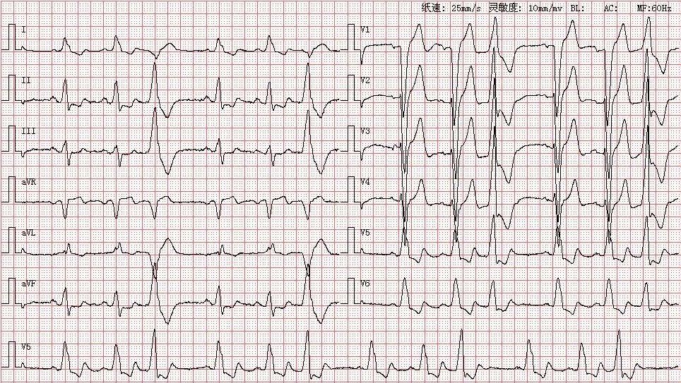 患者入院心电图,提示为窦性心律,完全性左束支传导阻滞,qrs波明显