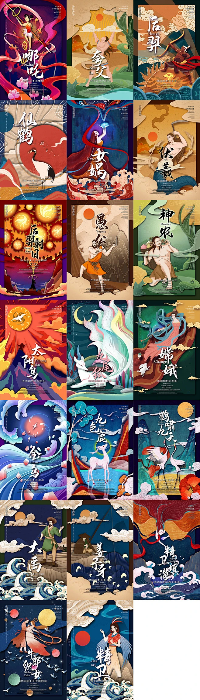 中国神话故事插画女娲哪吒嫦娥神农美工设计海报设计素材