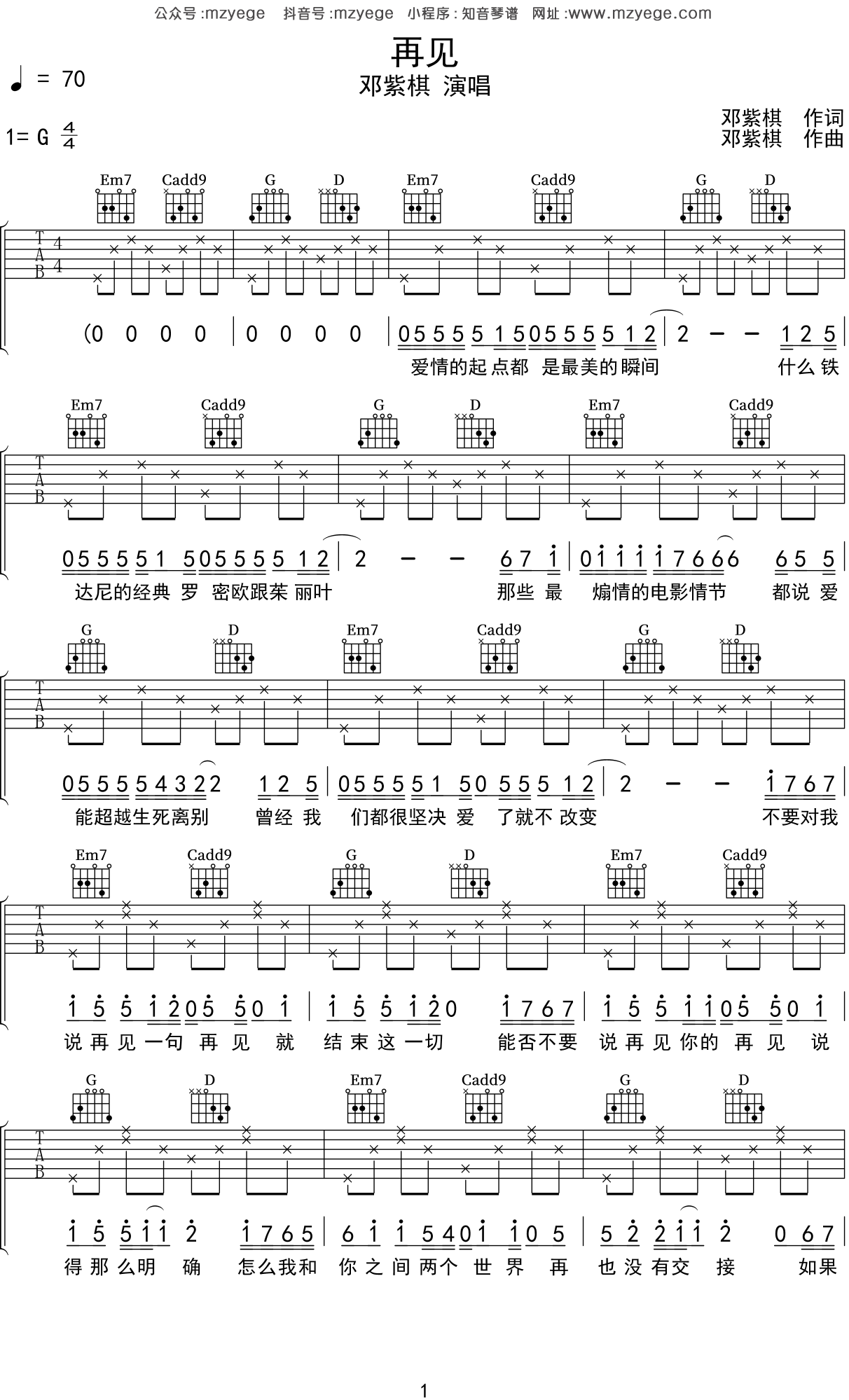 《再见》邓紫棋 _吉他弹唱谱