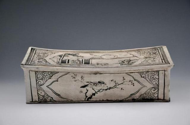磁州台刻花瓷枕.金/元登封窑珍珠底,剔底刻花梯形枕,高11c - 抖音